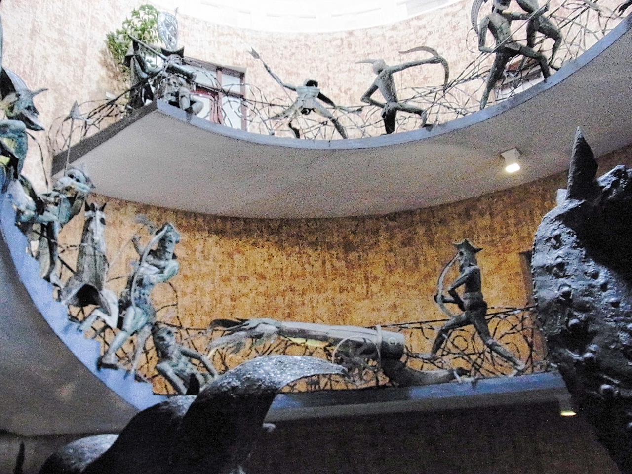 彫刻家ラキ・セナナヤケの手がけたオブジェがある螺旋階段を上がると、目に海が飛び込んできます。