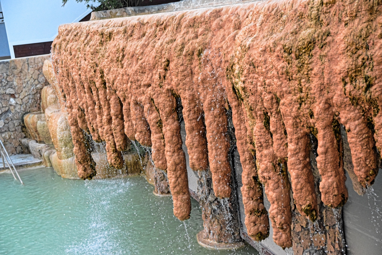 プールの上には段階状に温泉があるが硫化水素臭のする硫黄温泉、茶褐色のツララ状の泥の塊がプールへと垂れ下がっているので鉄分が相当含まれています。