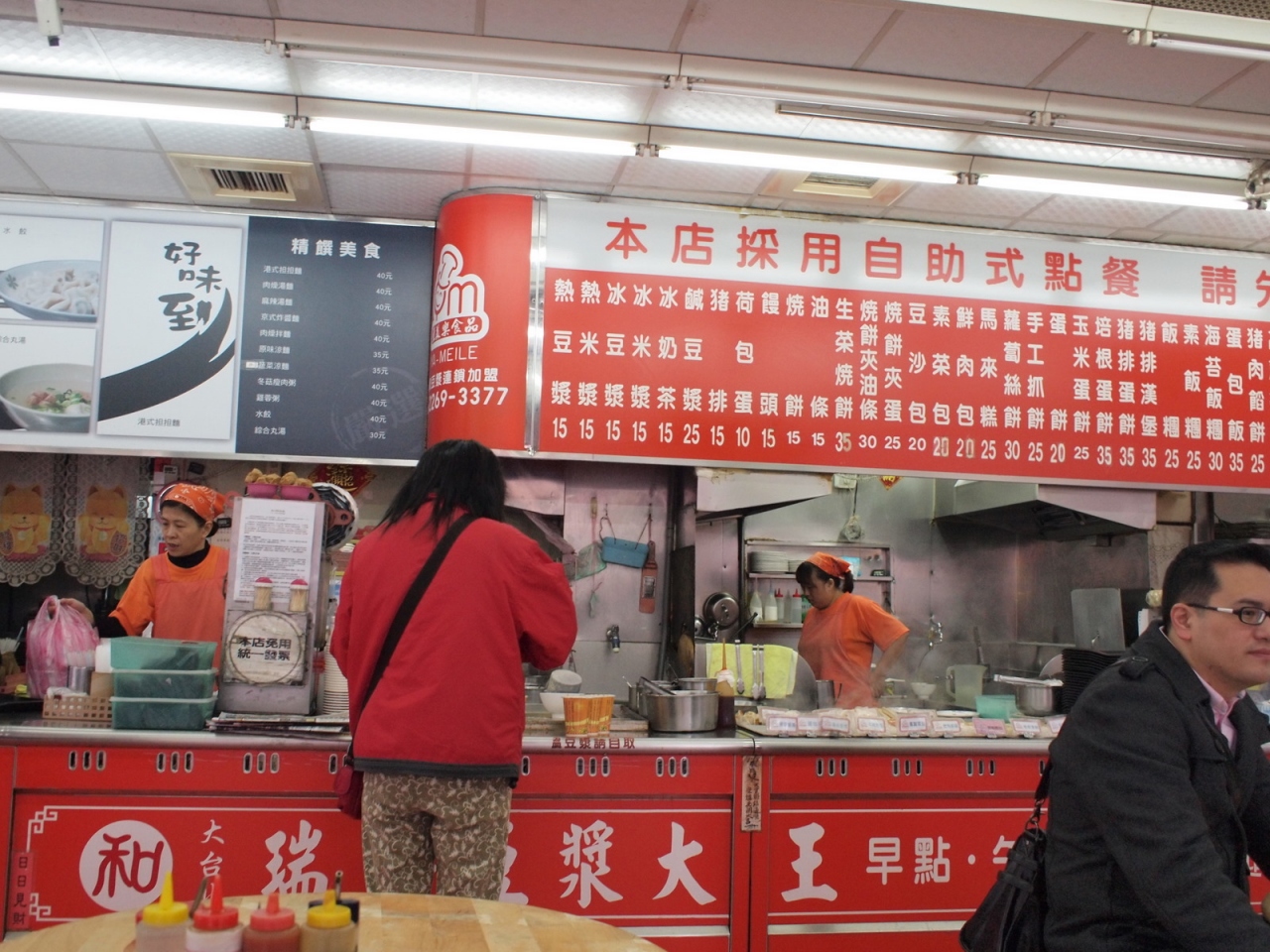 台湾の朝ご飯屋さん。学食のような?スタイルで、キッチン前のカウンターを移動しながら好きなものを注文、それを受け取りつつ最後にレジ、という形式でした。