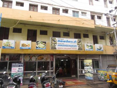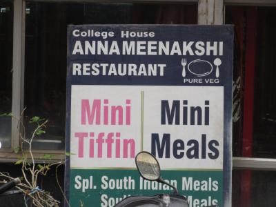 West Perumal Maistry St.沿いにあるPure Veg.食堂。実際の屋号は「College House Anna Meenakshi」で,ホテル「Neww College House」(wはふたつ)の建物の中に入っている。