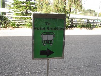 出口の外にトランジットホテル行きバス乗り場のサインが見える(写真参照)。出口を背に右手のほうへ進んだ先に,各ホテルのマイクロバスが並んでいる駐車場があった。そこでバウチャーを見せ,該当のホテルのバスに案内してもらう。