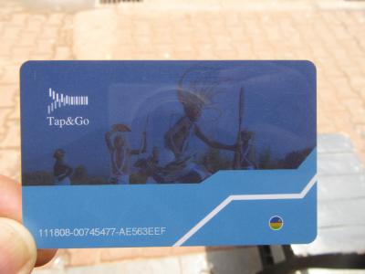 バスの運賃は「Tap&Go」という非接触型ICカードを購入して乗車時に決済しなければならない(運転手によっては現金を受け取ってくれることもある)。カードは主なバス停で購入・チャージ(トップアップ)が可能。バス停の周辺でPDT(ハンディターミナル)を持っている人がいたら,それが係員だ。初回購入費用は1000RWFで,500RWF分がチャージされている。バスの運賃は1回250-270RWF前後だと思う(254とか半端な値段で,路線によっても異なる)。