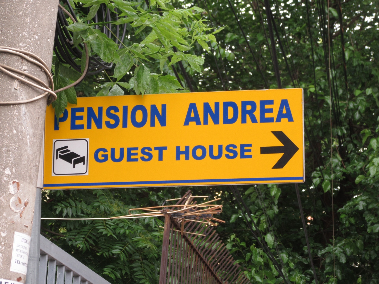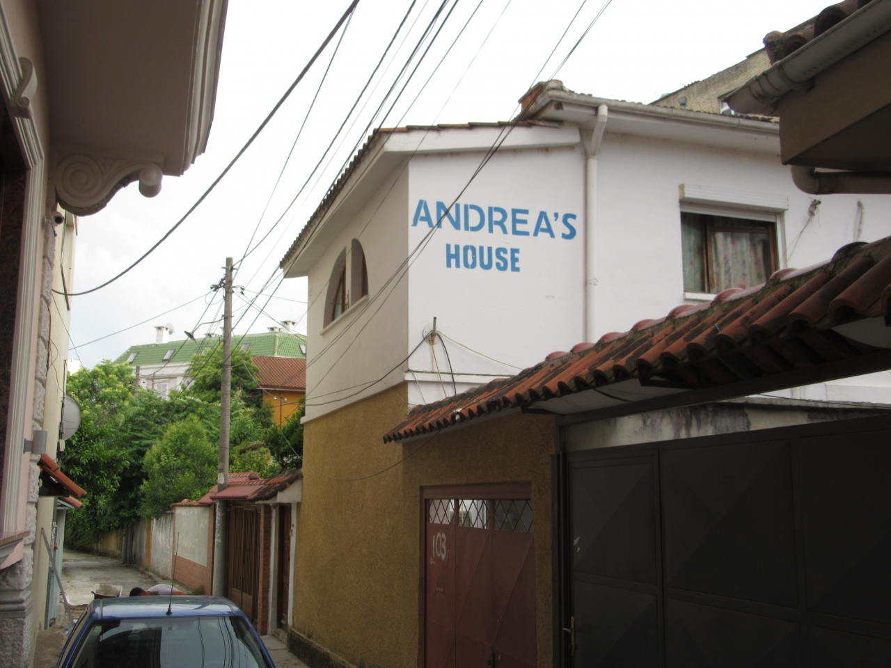 宿の近くまで来たら,まず表通り(ジョージ・W・ブッシュ通り)から看板が見える「Hotel Antik」を見つけ,その小路を同ホテル方向へ進む。すると途中に「PENSION ANDREA」の小さなサインがあるので,そこを右折する。右折して10mほどで「ANDREA’s HOUSE」と壁面に大書された住宅がある。それがこの宿である。もし門の鍵がかかっていたら誰かが来てくれるまで待つしかないが,周辺には良いカフェが何軒もあるので気にすることはない。