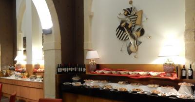朝食は、朝7時にはブッフェの用意ができていました。絞り立てのオレンジジュースをピッチャーに入れて置いてくれるのが、とても美味しく、給仕の若い女性も笑顔で感じの良い方でした。連泊すると、一品だけ、一口サイズの総菜が日替わりで違う品が出るのが、楽しみでした。茄子とチーズを合わせた品が美味。