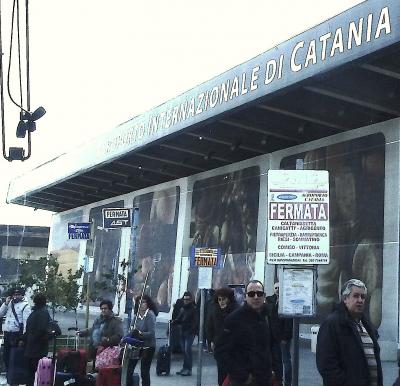 空港のバス停では、複数の会社のバスが発着します。空港が終点でなく通過点のため、一時停車するだけで、すぐ発車します。バスの本数も少ないため、シチリアの地元の乗客も、乗りそこねないよう、ベンチにも座らず、バス停に立ったまま、バスが来るのを待っていました。