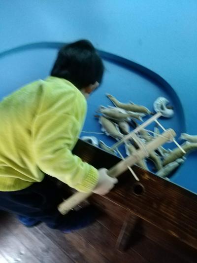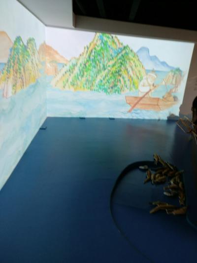 釣り。釣り竿を引くと映像からつった魚が出てくる