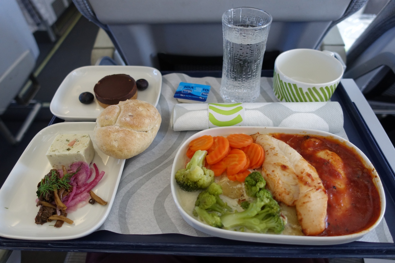食事はエコノミーとちがい、ちゃんとしたものが出ます。グラスはイッタラのグラスでした。