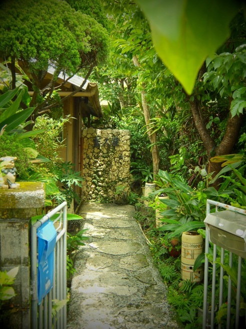 駐車場の奥に看板があり、看板の前に置かれている植木鉢にに沿って歩いていくと、門の奥にお店がありました。