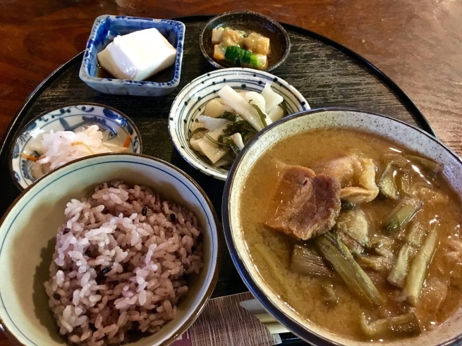 人生初の琉球料理「むじぬ汁定食」(1,300円)が登場しました。おそるおそる食べ始めましたが、どのお料理もとても優しい感じの滋味深い味わい。。。私の今までいただいてきた沖縄料理とは明らかに一線を画する感じのモノでした(驚)。