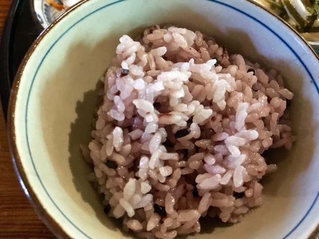 「お赤飯」。小豆ではなくて古代米が用いられています。モッチリとして美味しい。首里ではもち米ではなくうるち米を使うそうです。