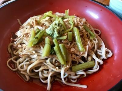 山葵のすり下ろしと山葵の茎がお蕎麦の上にトッピングされています。
