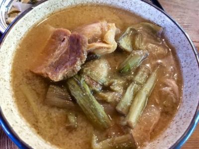 緑色の長細い食材が「ムジ」ですが、しんなりと柔らかくて独特の食感。おいもも入っています。