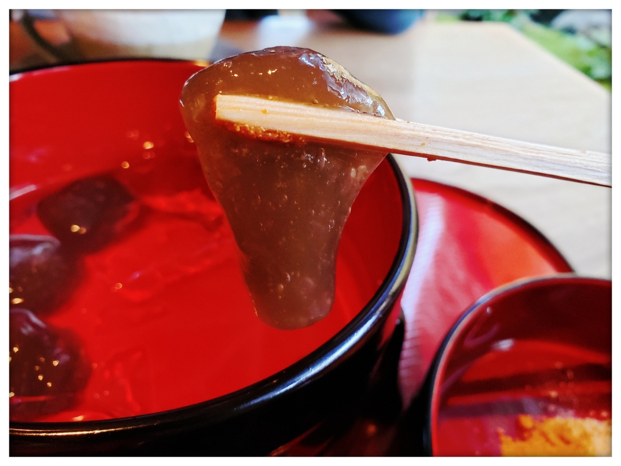 本わらび餅の出来立てを食べられるのは嵐山店だけだそうで、ぷるぷる、もちもち、とろりで最高です。