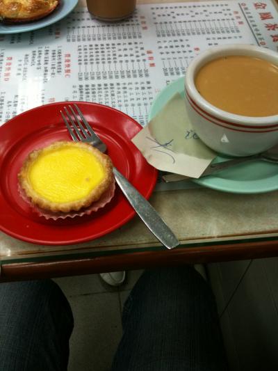 私が頼んだのは暖かい「ヤンヤン」と呼ばれるミルクティーとコーヒーを混ぜたものと、エッグタルト。ヤンヤンはすごく濃厚で、癖になる味。でもエッグタルトは、甘さ控えめで、なんだかさっぱりした・・・という感じでした。