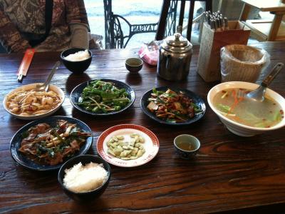 メニューは基本的に客家料理。有名なもの(ex.薑絲炒大腸、客家小炒など)は一通りそろっています。自分ですらなくてもデザート(?)として、擂茶も出してくれます。料金は観光地設定なので、2人セットで500元。(こっちの物価で安いとはいえませんが・・・。)でもその分、お腹はいっぱいになります。ご飯も食べ放題。お土産として、擂茶の粉末も販売しています。