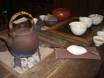 どのガイドブックにも載っている、結構、有名なお店、「九イ分茶坊」です。確かに、ここ、観光客はかなり使いやすいところだと思います。日本語で説明してくれるし、お茶の入れ方も教えてくれるし、それより何より、雰囲気がとてもいいです。茶器などの、陶芸のギャラリーなども創設されていて、内装も凝ってます。天気がよければ、見晴らしもかなりいいところですし、窓から提灯が下がった、有名なお店も見渡せます。