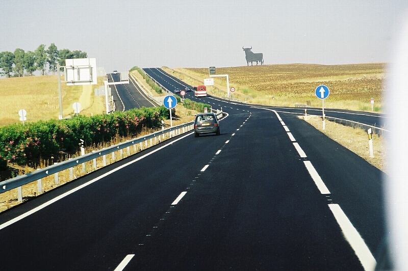 バスはセビーヤの南東に向かって走っている。エル・アラハルまでは立派な高速道路(自動車専用道路?)だ。丘の上に巨大な黒いトロ(雄牛)の看板。商業広告を国道からすべて撤去したあとも、いかにもスペインらしいこのトロの看板だけは観光用に残している。ただしメーカー名も何もいっさい入れない約束だという。