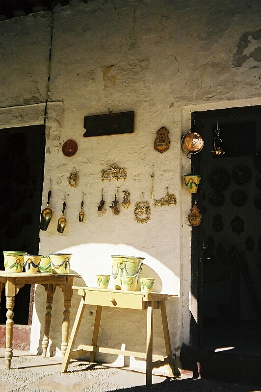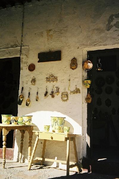 旧市街の入口に安物のみやげ物屋と骨董屋がある。骨董屋の白壁には真鍮の皿や杓、ロバのベルなどをいくつもぶら下げている。さほどのものはなさそうだ。真鍮や素朴なマジョルカ焼きの台所や園芸の日用品が多く、その他はガラクタだ。「本物か」と聞くと正直に「レプリカだ」と言う。「本物はここだ」と指さしたのは、小さなテーブル上の僅かな点数だった。