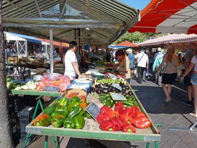 市場には赤、黄、緑とカラフルな商品が並べられており
