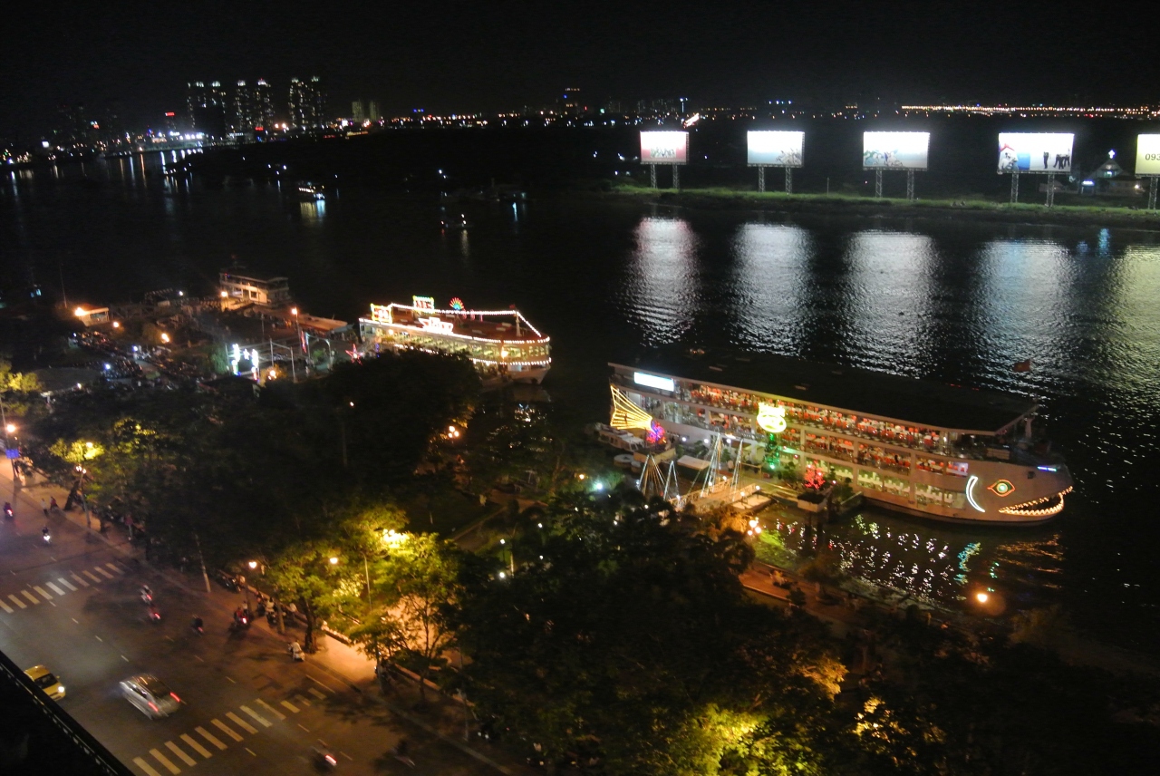 サイゴン川の夜景は遮るものはなく、ディナークルーズ船の離着岸を眺め、夜風に吹かれながら(一応屋根はありますが、オープンテラス状です)優雅な時間を過ごせます。