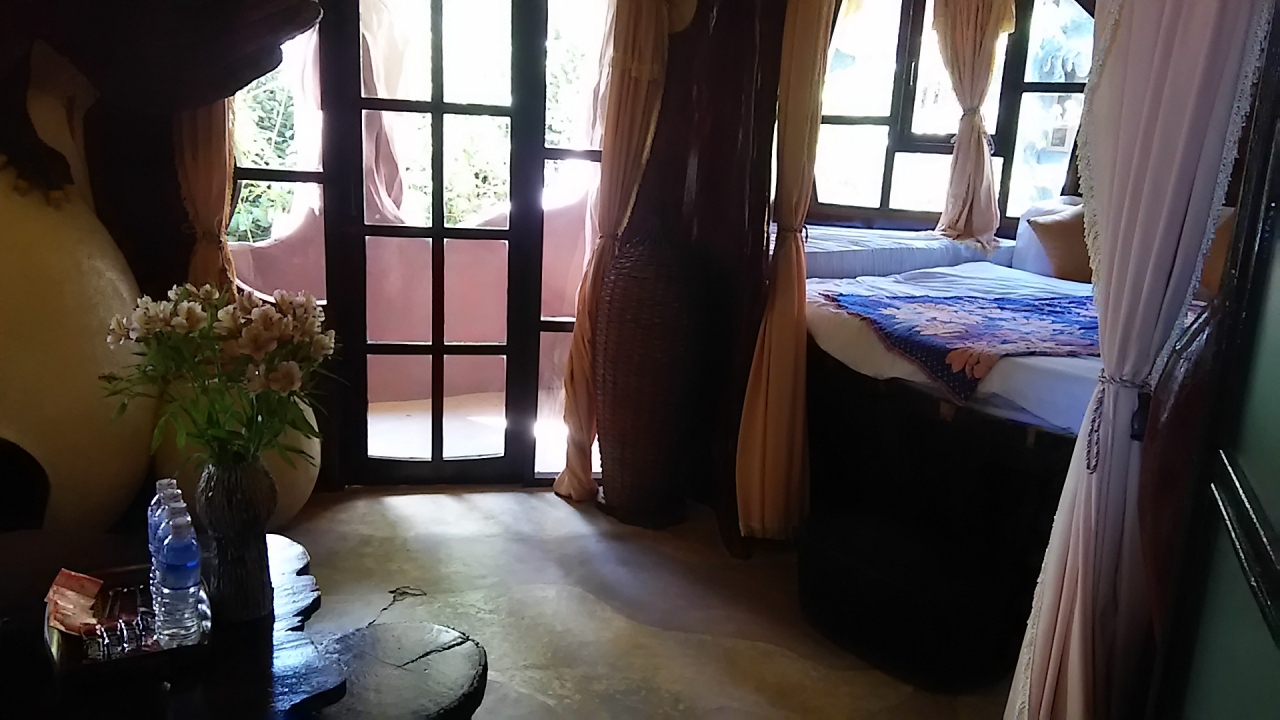 ガウディか?ディズニーか?と思うくらい変な建物です。色彩もきれいでとてもおもしろいですが、実際に泊まるのはちょっと考え物です。8時半から観光客が入るので、客室のドアをガチャガチャやられます。