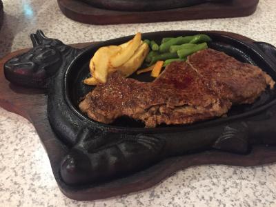 牛の形の鉄板が面白い!ザ!ステーキ!という感じで肉肉しいおいしさ。くせになります。