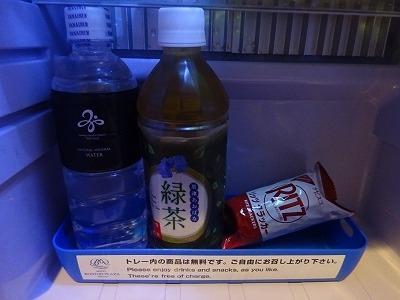 食事無しプランだったけど、駅周辺にデパートやショッピングセンターもあるし、1階にコンビニエンスストアも入っているので食事に不自由はなかった。また、冷蔵庫内のペットボトルのミネラルウォーター1本、緑茶1本、リッツが無料サービスなのは嬉しかった♪