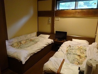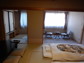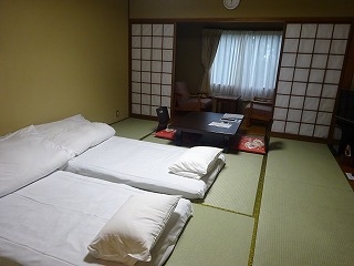 室内に布団が置いてあったが夕食中に敷かれてはいなかった(^_^;)。しかもイマドキ見かけないほどの薄ーーいせんべい布団1枚だけだったので、座布団を敷いた上に布団を敷いて寝た。