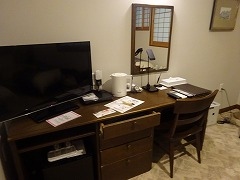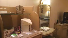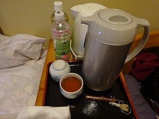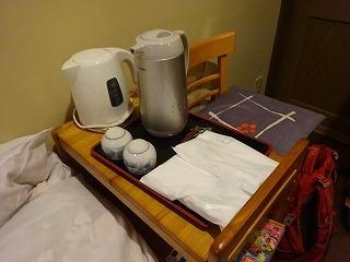 部屋に湯沸かしポットとは別にほうじ茶入りのポットも用意されていたのは嬉しいサービス。部屋には冷蔵庫無し(食堂奥に共用冷蔵庫があった)。