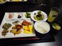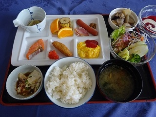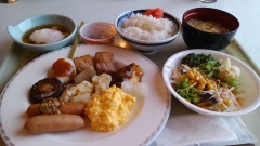 ビュッフェ式の朝食は沖縄らしいメニューもちょっとだけあって充分な品揃え。「無くなると補充されない」というクチコミも見かけたがそんなことはなく、厨房のオバチャンたち、頑張って補充してました。