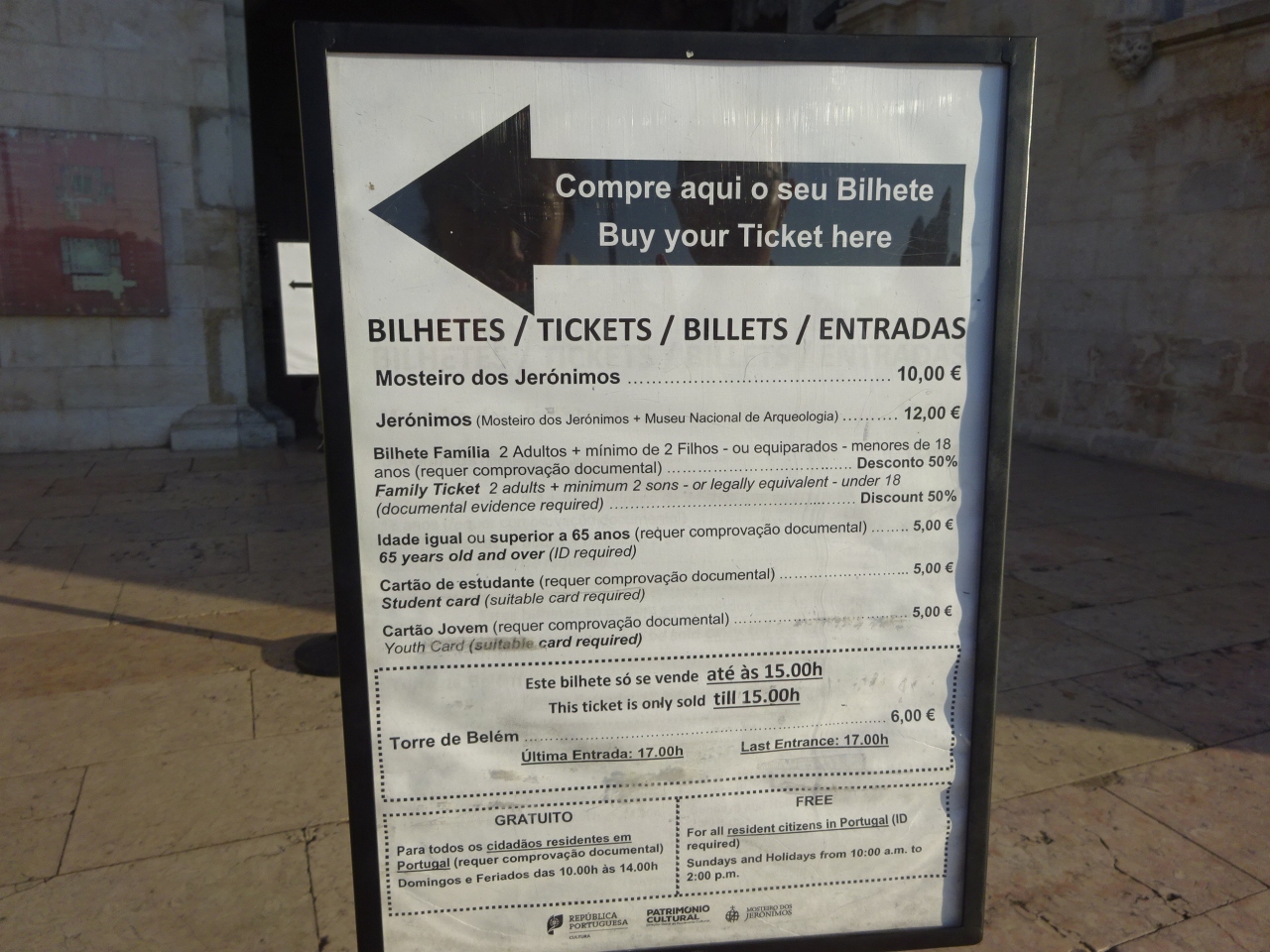 窓口には記載は無かったが、チケット購入列の入り口に立っていた看板に「ベレンの塔」のチケットの金額の記載もあったので、窓口で聞いてみたら同時購入OKとの事だったので一緒に購入(セット割引等は無し)。