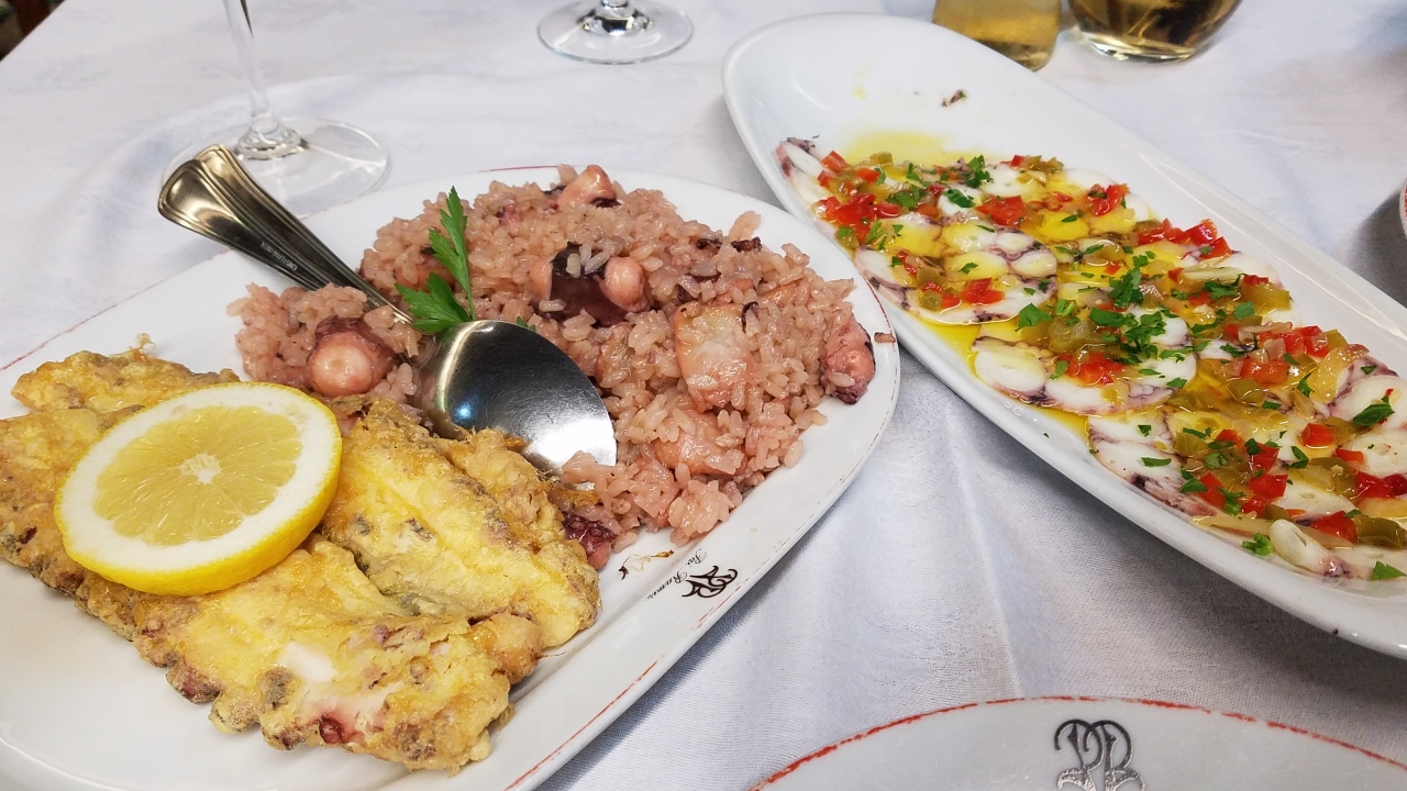 タコのカルパッチョ、タコの天ぷら&タコ飯のセット、サラダ(小)をオーダー。全て美味しくて日本人向きの味でもあります。