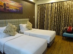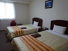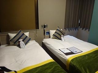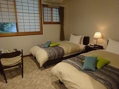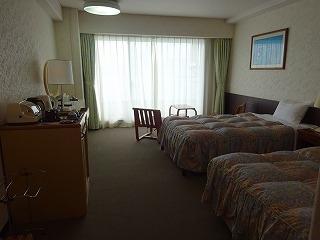 洋室ツインの室内は広々でスーツケースも充分開いて置けた。