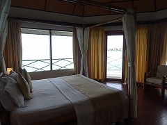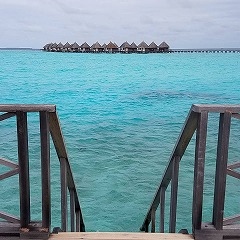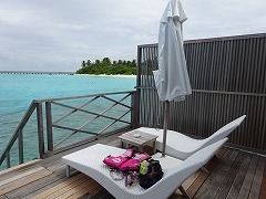 スーペリア水上バンガローは1部屋1棟。バルコニーから海へ降りる階段あり、室内に海を覗けるガラステーブルありで、いかにもモルディブらしい造り。