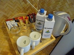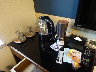 室内備品:冷蔵庫あり、湯沸かしポットあり。ペットボトルのミネラルウォーター1人1本、紅茶・コーヒーは毎日補充される。