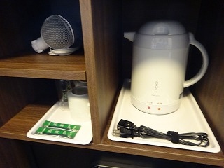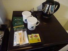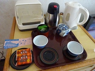 湯沸かしポット:有り。緑茶ティーバッグと湯飲み茶碗とグラス。コーヒーカップが欲しかったな~