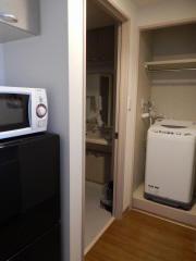 バス・トイレ別、キッチン用品は一通り揃っている、以前は置いてなかった食器洗剤とスポンジも有り。電子レンジ、冷凍室が別になってる大きめの冷蔵庫も有って暮らすように過ごせる。