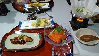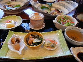 夕食は地場産品をふんだんに使った会席スタイル。小鉢、前菜、刺身、酢の物、揚げ物、焼き物、蒸し物、サラダ、椀物&飯物、果物 と次から次へと出てきてテーブルの上がい~っぱいで食べるのに大忙し!(笑)