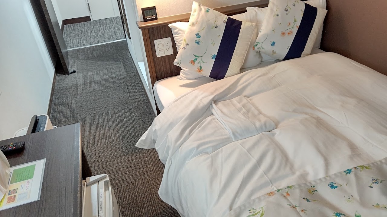 毎日ペットボトルのお水がもらえます。狭いのですがきれいな部屋でよかったです。枕が2つとクッションが2つあり、抱き枕としていくつも利用できたのがうれしかった。欲を言えばテレビの位置が高くて少しみにくい。朝食が美味しいらしいのですが今回は利用しませんでした。