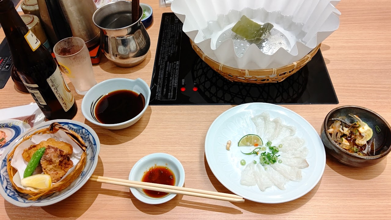 おおさかいらっしゃいキャンペーンで13,000ポイントもらったのでどこで使うか考えていたのですがふぐのメニューがあったのでここで食べようと思い行ってみました。比較的ゆとりのあるスペースで落ち着けました。その後もすき焼き、おすしと火を変えて3回通ってポイントを使い切りました。ふぐ満喫コース5千円って個人的にはかなり安く感じました。