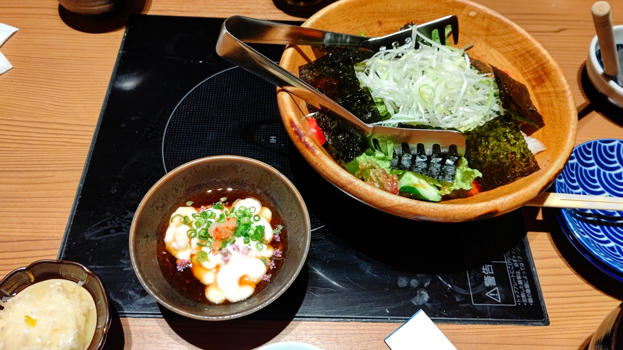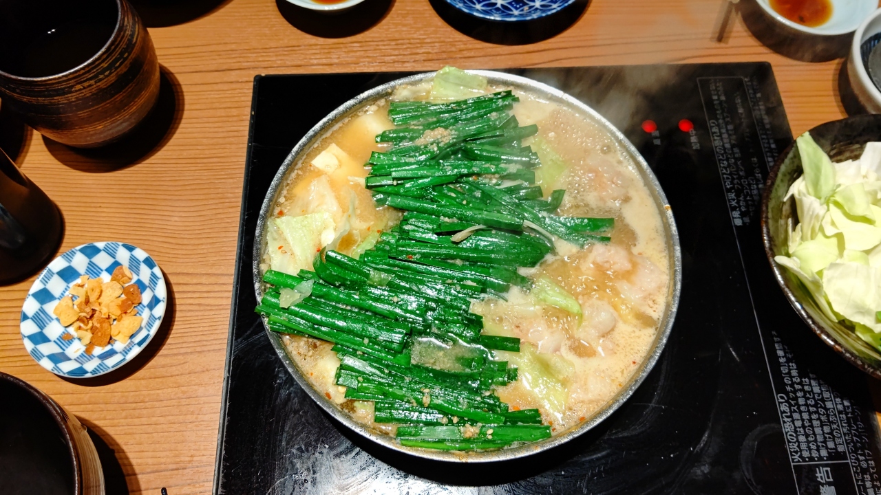 もつ鍋とイカの生き造り、酢モツ、タラ白子ポン酢、サラダを注文。ドリンク、料理とも注文してすぐに届いた。待たされることなかったのは高評価。料理もおいしく、特にもつ鍋のモツは絶品だった。