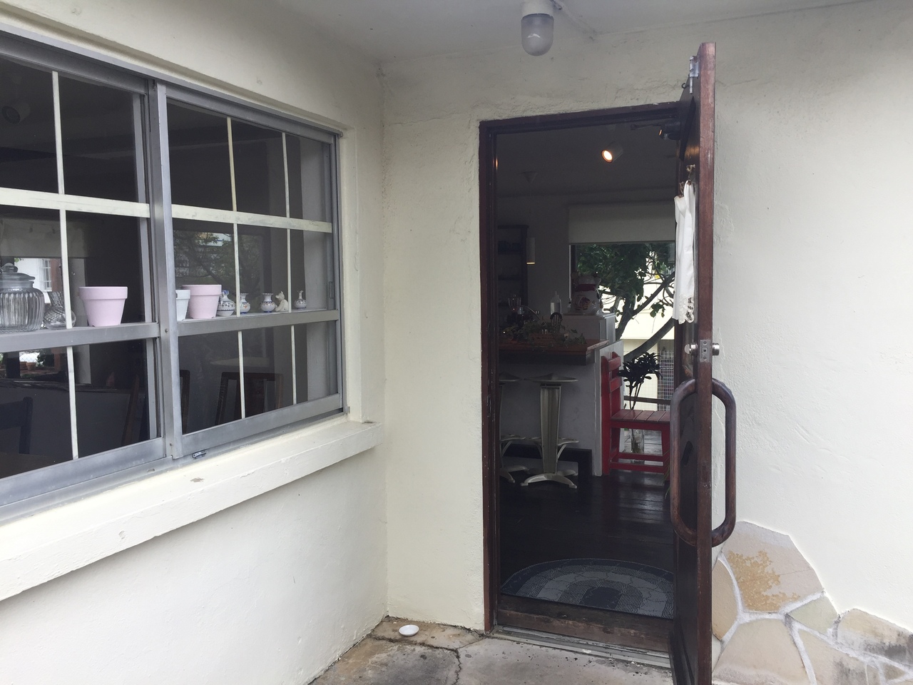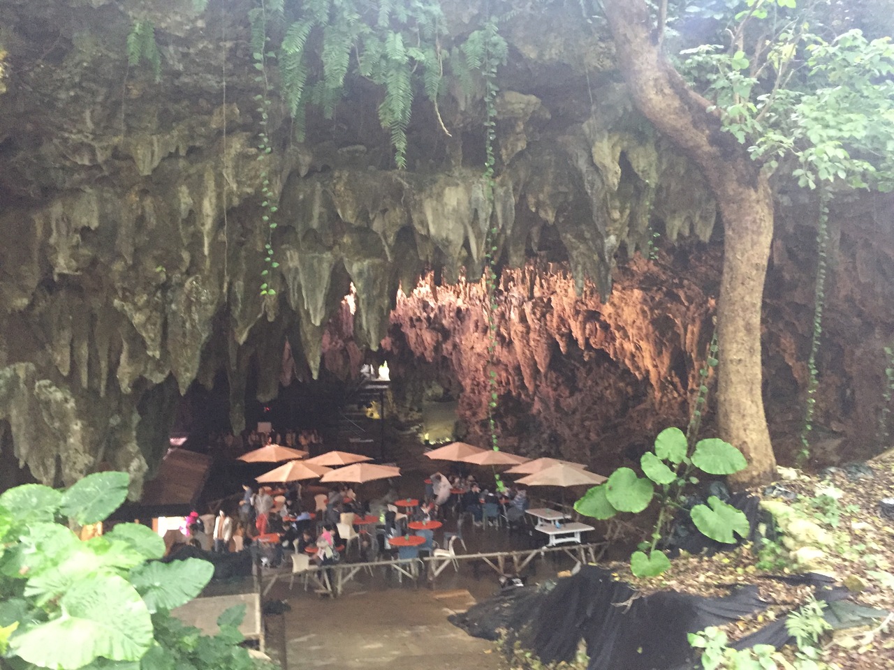 ガンガラーの谷の入口 ぽっかりと空く鍾乳洞スペースがそのままオープンカフェとなっている。