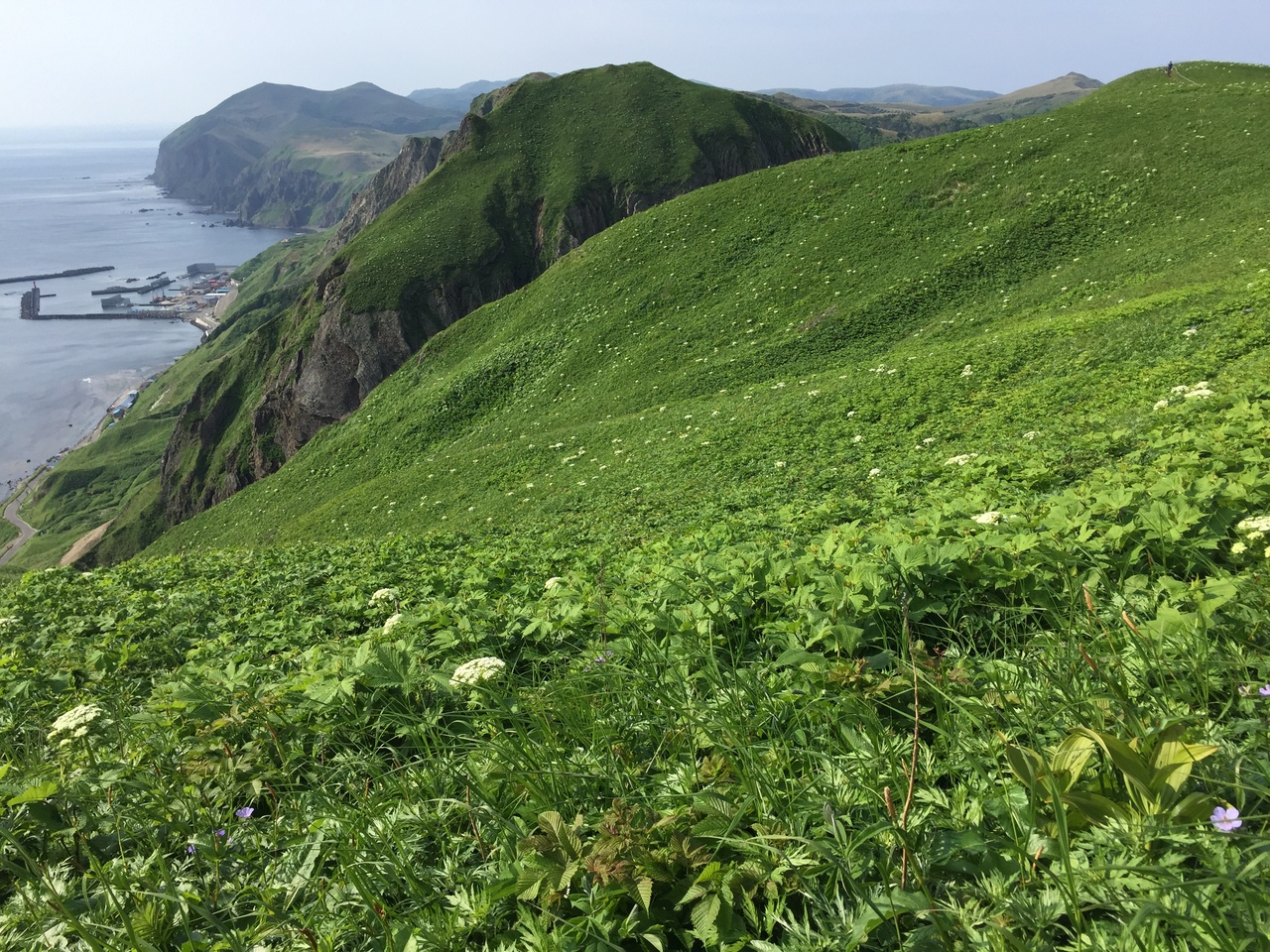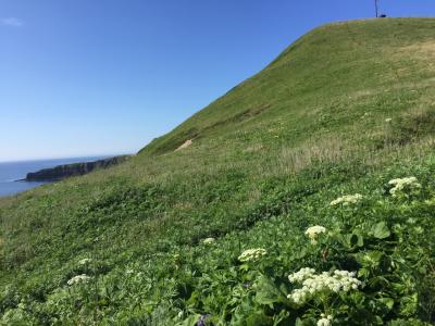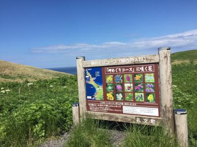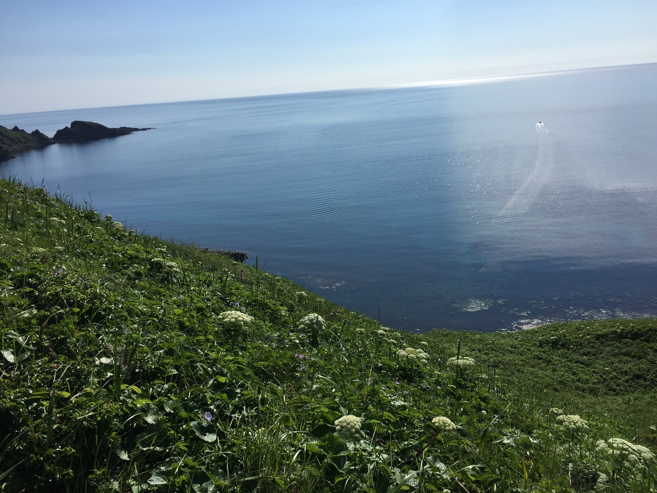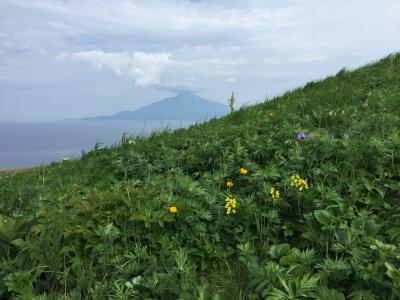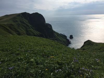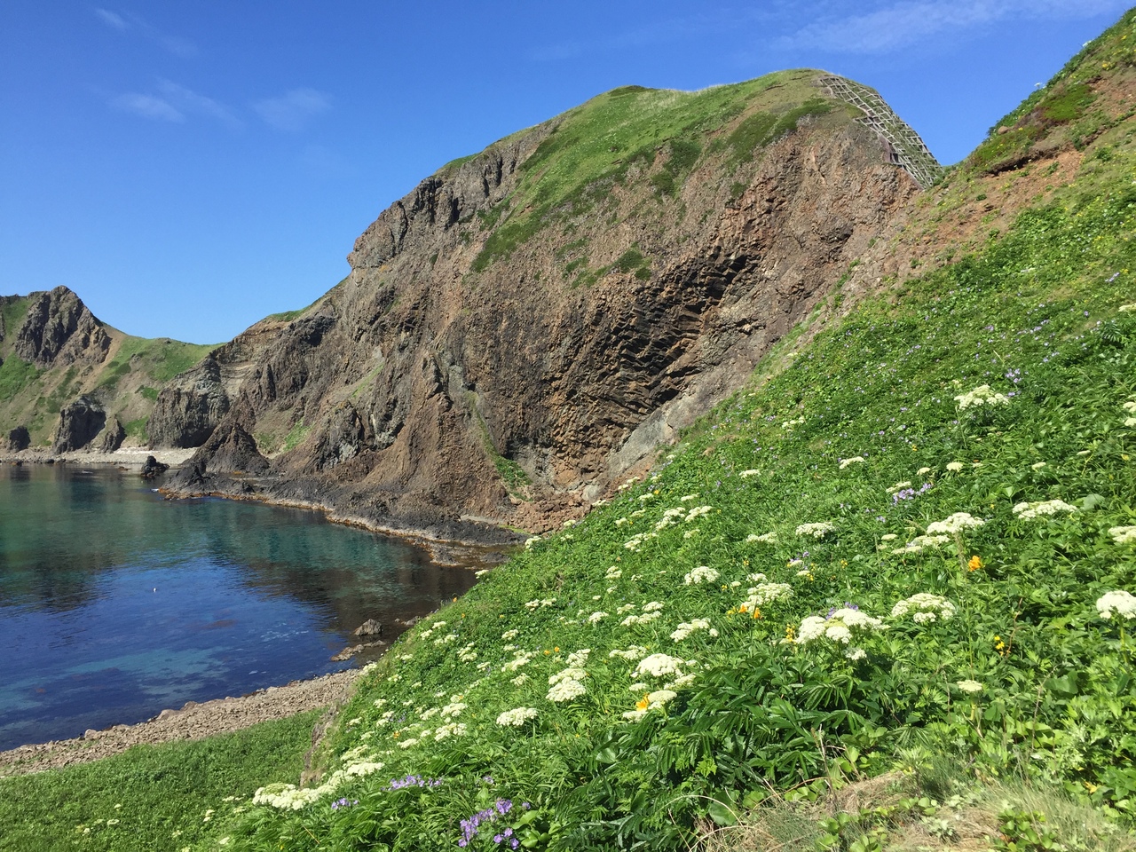 チシマフウロの紫 レブンキンバイソウの濃い黄 レブンシオガマの白 それはそれは美しい花畑が広がり 海の景色とも相まって絶景!