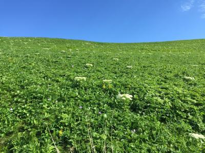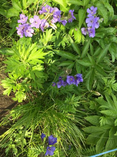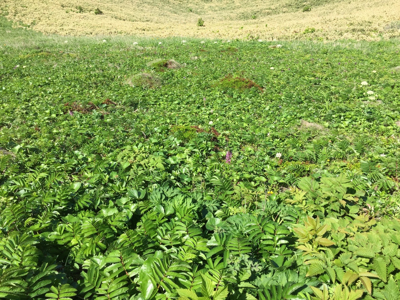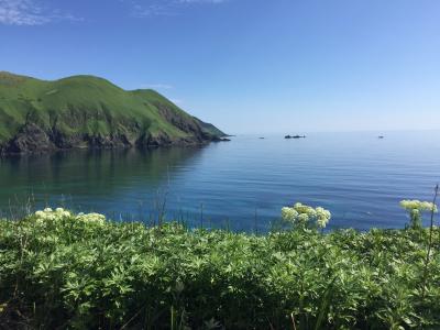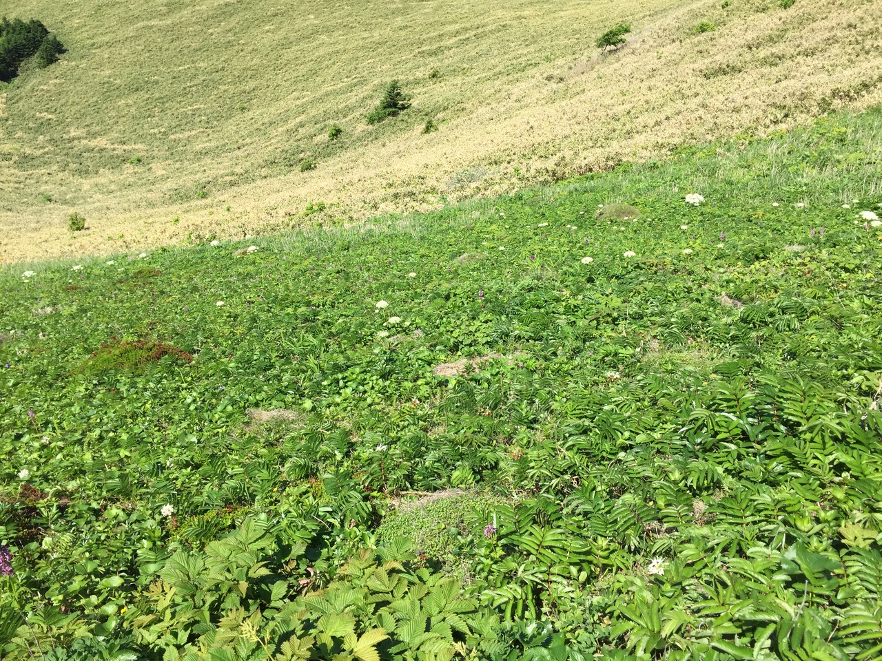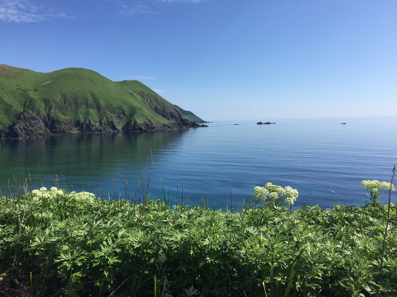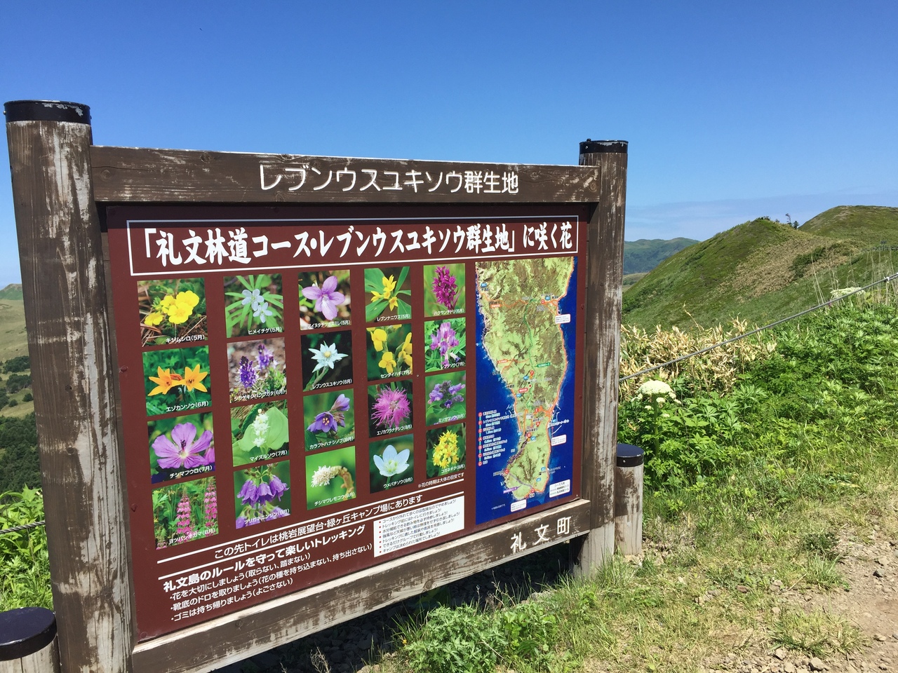 チシマフウロの紫 レブンキンバイソウの濃い黄 レブンシオガマの白 それはそれは美しい花畑が広がり 海の景色とも相まって絶景!