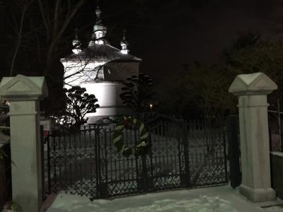 この日の函館は雪景色になっており 雪景色の中のライトアップされた聖堂は美しい かった。