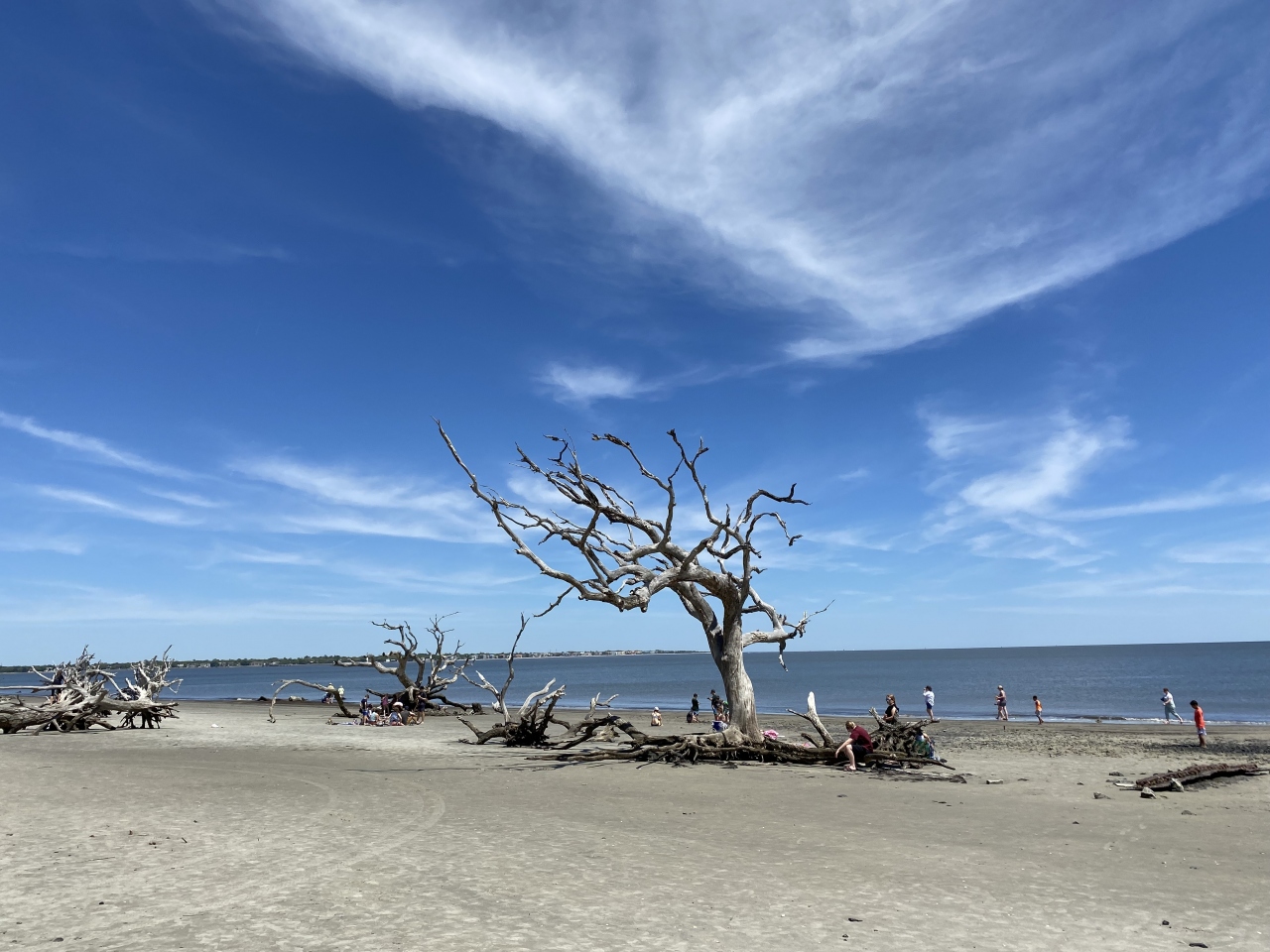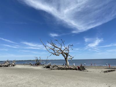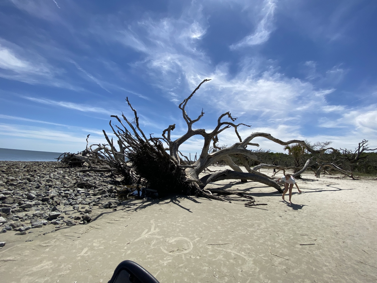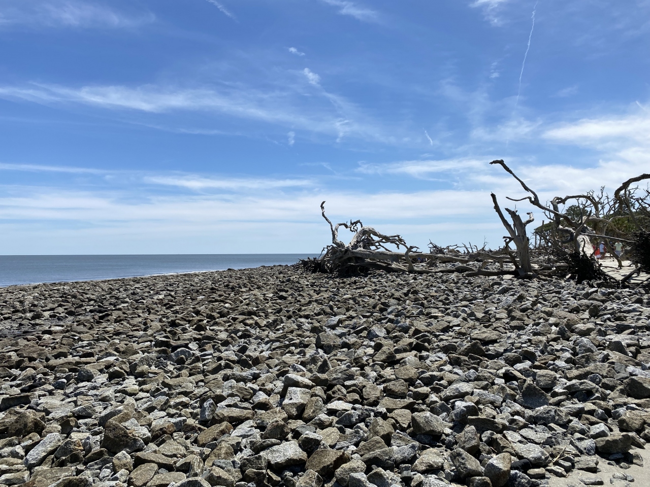 島の北端から東へ回り込んで、ビーチ・ビュー・ドライブという道路に入ってすぐのところにある「ドリフトウッド・ビーチ(Driftwood Beach)」へ。ここは駐車場がないので皆さん路肩にクルマを駐めています。遊歩道の先に「ドリフトウッド・ビーチ」が開けます。その名の通り、”漂流する木”がたくさんあるビーチ。かつては海の森だったものが、今では風化した木の幹や枝が並ぶ砂浜です。これらの木は根を張っていません。何十年にもわたって根元が浸食され風化しつつあります。これはなかなか他では見られない、ゴールデン・アイルズの独特の風景だと思います。アメリカ屈指の美しいビーチとしても知られるだけのことはあります。