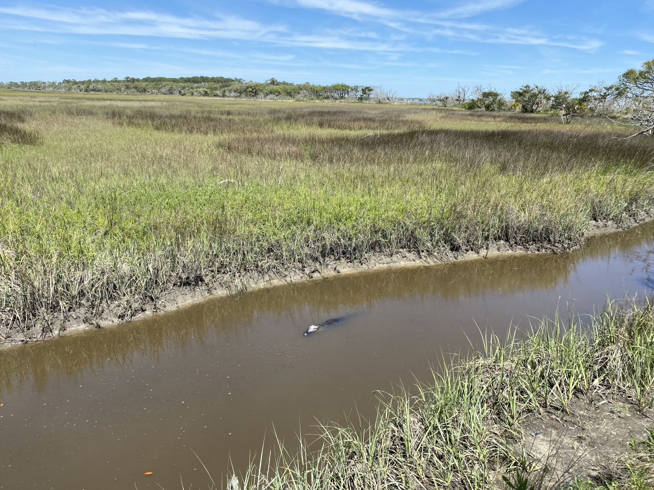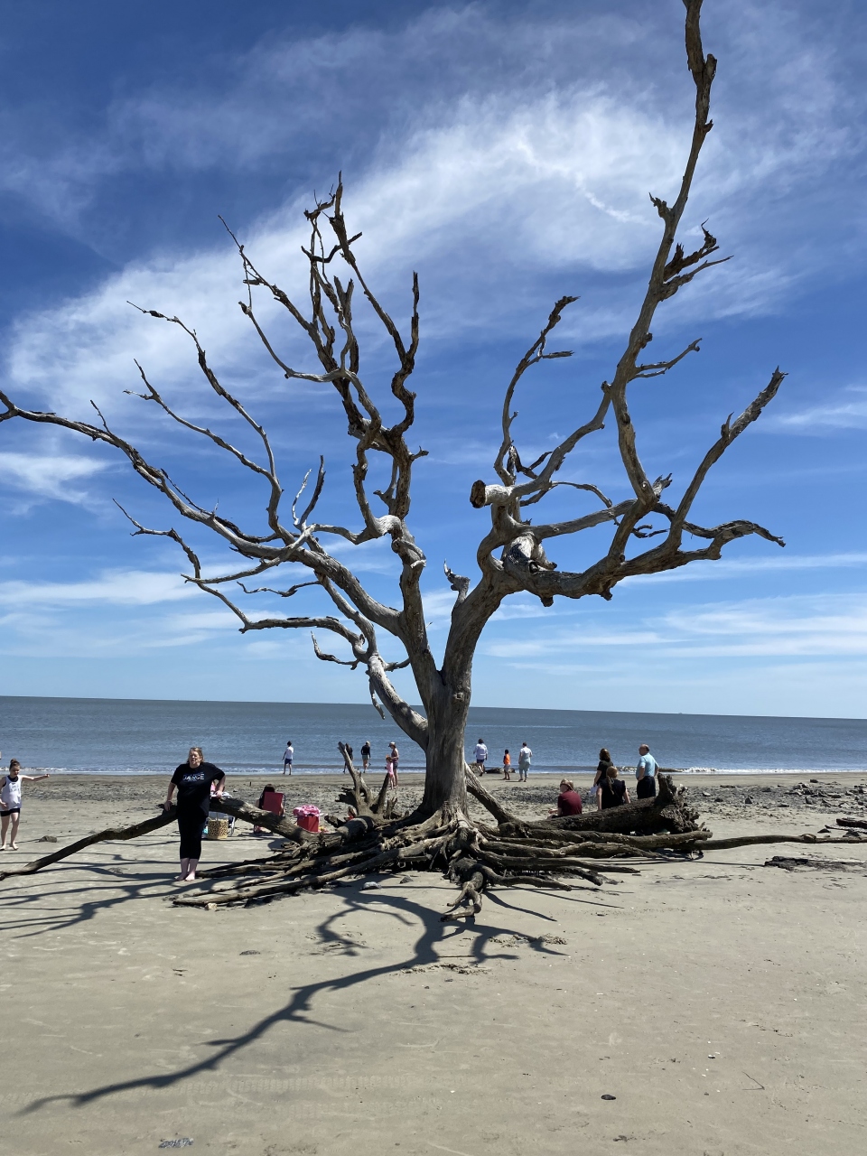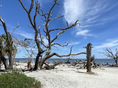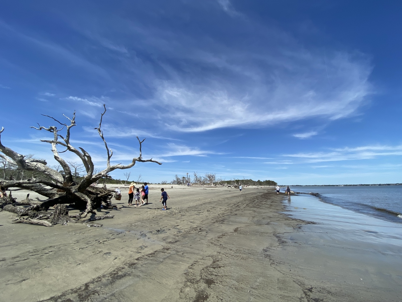 島の北端から東へ回り込んで、ビーチ・ビュー・ドライブという道路に入ってすぐのところにある「ドリフトウッド・ビーチ(Driftwood Beach)」へ。ここは駐車場がないので皆さん路肩にクルマを駐めています。遊歩道の先に「ドリフトウッド・ビーチ」が開けます。その名の通り、”漂流する木”がたくさんあるビーチ。かつては海の森だったものが、今では風化した木の幹や枝が並ぶ砂浜です。これらの木は根を張っていません。何十年にもわたって根元が浸食され風化しつつあります。これはなかなか他では見られない、ゴールデン・アイルズの独特の風景だと思います。アメリカ屈指の美しいビーチとしても知られるだけのことはあります。
