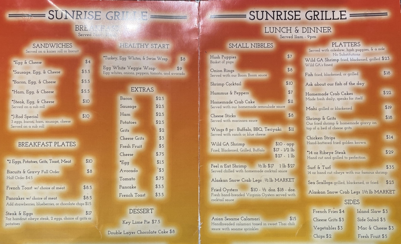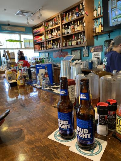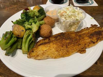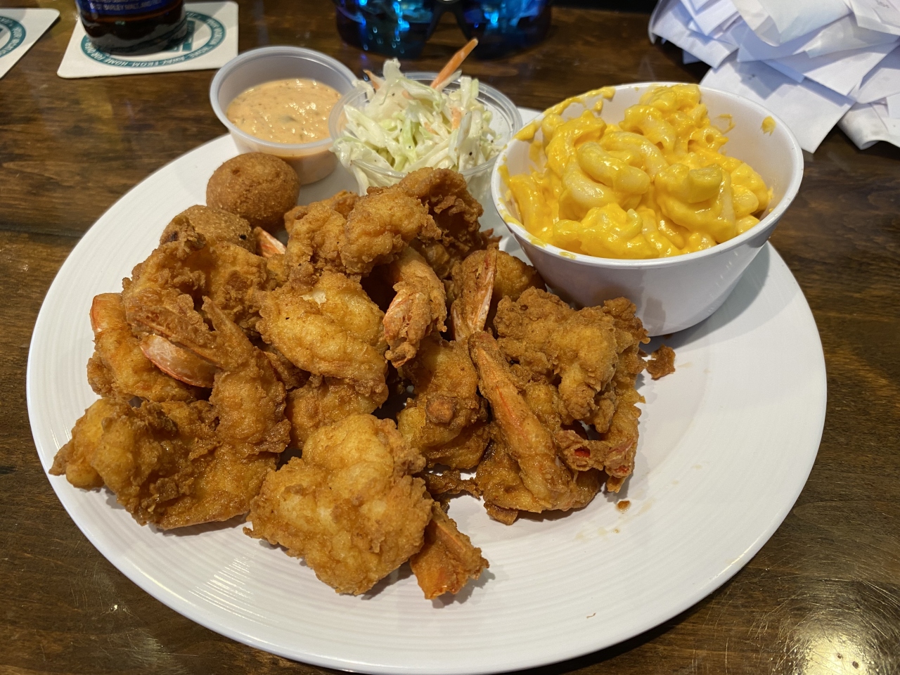 「ビーチ・ビレッジ(Beach Village)」というモールの中にあるアメリカ料理とシーフードのレストランです。人気店のようで結構混んでいましたが、カウンターならすぐ入れるということでほとんど待たずに着席。まずはビール。ちゃきちゃきした明るいマダムの対応がフレンドリーに対応してくれました。私はPratters(大皿料理)に「ワイルド・ジョージア・シュリンプ(Wild GA Shrimp)」のフライをチョイス。サイドにはあらかじめコールスローとハッシュパピーが付いていて、選べるサイドには”マック&チーズ”をチョイス。妻は「フィッシュ」のブラックンド。選べるサイドはベジタブル。ブラックンドとは、ケイジャン風のブラックシーズニングを絡めて焼いたもの。リゾート地のモールなので安くはないですが、南部らしいジャンキーな味の濃いシーフードはビールに合い美味かったです!