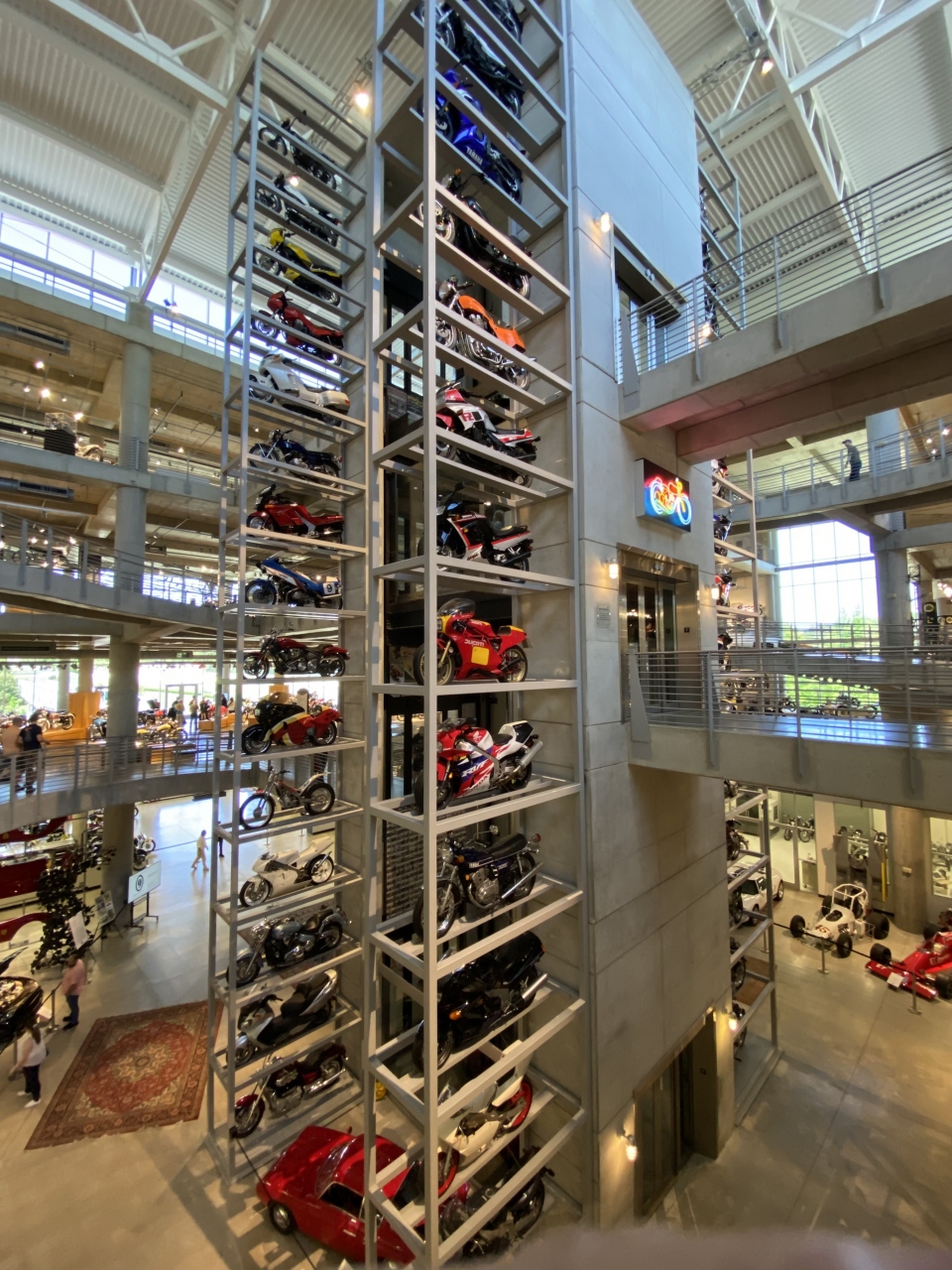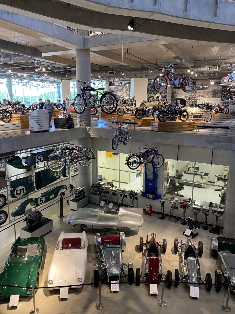 とんでもない数のモーターバイクと、少なくない数のレースカーが展示されてます(じっくり見るには半日は必要)。館内に入るとまずレースカーが目に入るのですが、ロータスのレースカーのコレクションとしてはここが世界最大なのだそう。そして、圧巻なのはなんといっても2輪車の展示。エレベーターホールにびっしりと掲げられたモーターバイクにまず度肝を抜かれます。地下から5階まで、数えきれないほどの色々なカテゴリー、年代のモーターバイク(やクルマ)が並べられており、「世界最大のヴィンテージバイク博物館」という謳い文句に偽りはありません!さらに、ミュージアムの外を見ると、インディカーのレースが始まっていました。レースの入場料を払わず観戦できるので、その日を狙って訪れるのもおススメです。この博物館の真骨頂とも言えそうなのはヴィンテージバイクのコーナー。1867年に製造された、アメリカのローパーによる蒸気で走るベロシペード(足蹴り自転車)といった歴史的なバイクから、1900年代初頭の内燃機関で走るバイク(ハーレー・ダビットソンやインディアンなど)をたっぷりと見ることができます。モーターバイク好きなら一度は訪れるべき聖地と言えそうです。- 旅行時期