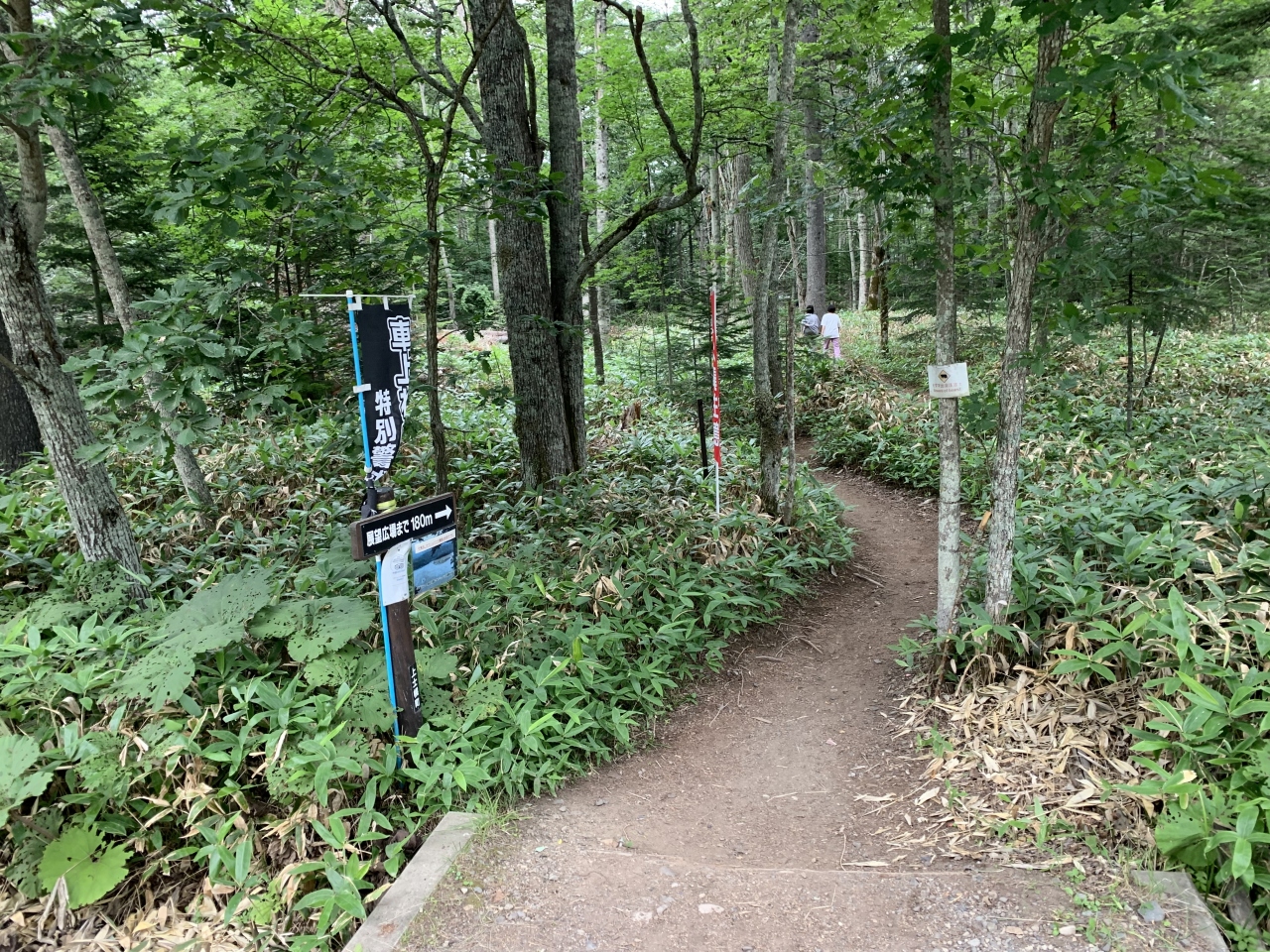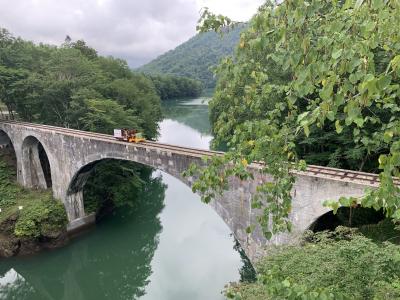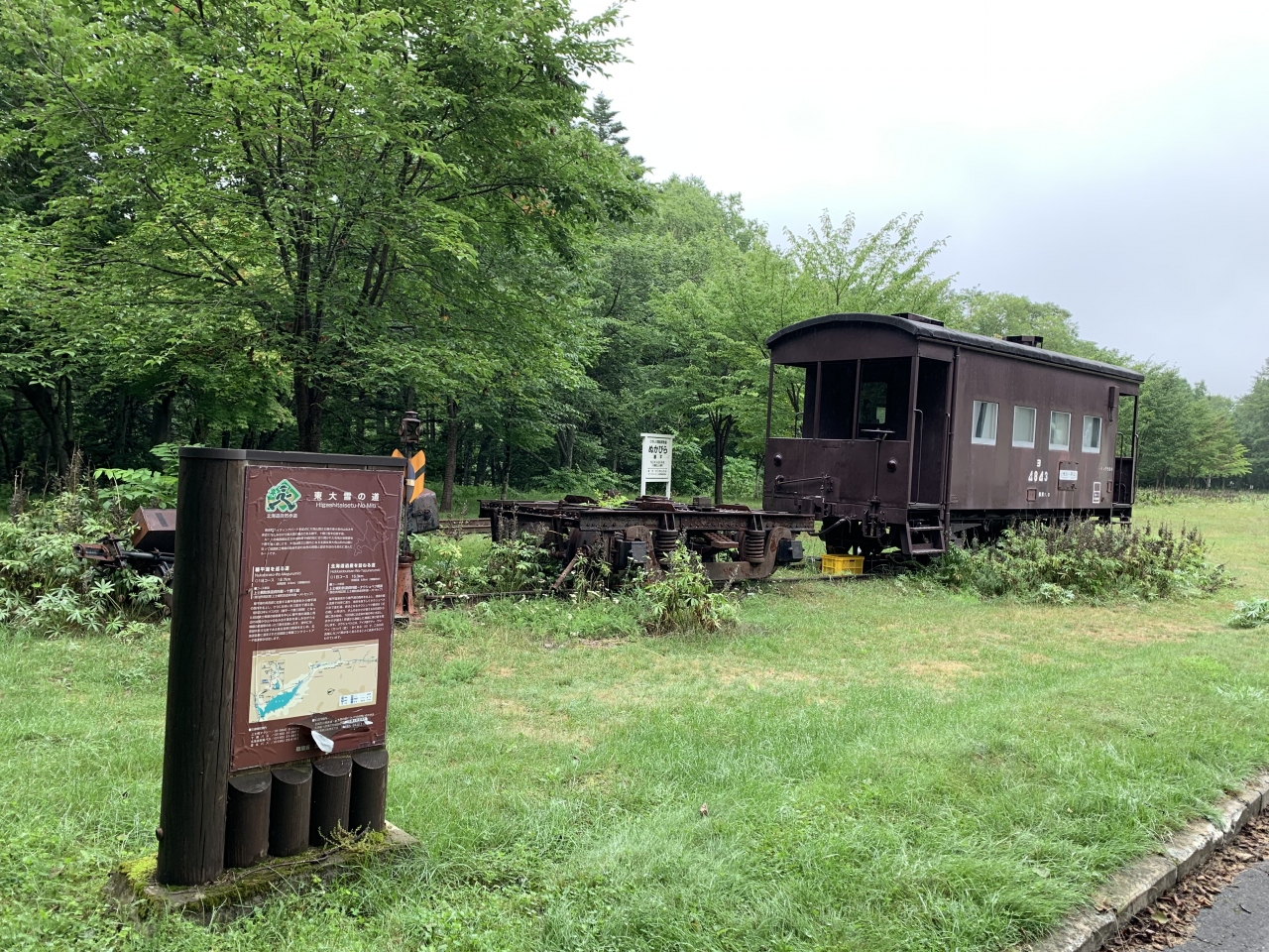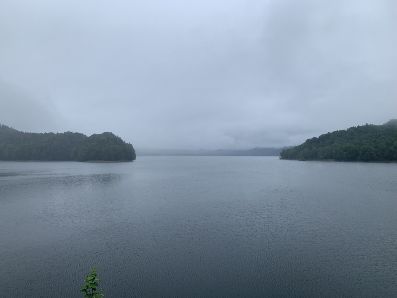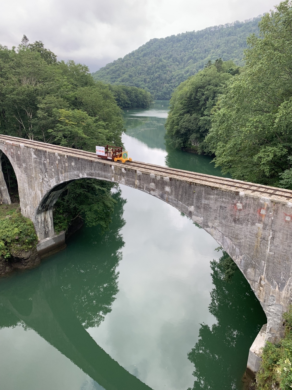 糠平湖畔に来た目的は「タウシュベツ展望台」です。旧士幌線の「タウシュベツ川橋梁」を展望できる場所です。林の中の遊歩道を抜けて展望エリアに来ました。タウシュベツ川橋梁は、昭和12年(1937年)に建設されましたが、現在はダム湖である糠平湖の底にあります。冬にはその姿を見せるのですが、6月頃から沈み始め10月頃には完全に水没するらしい。8月なら少しは見えるかなぁ…と思ったのですが既に水没してました。確実に見るのであれば、時期は熟慮した方が良いです。